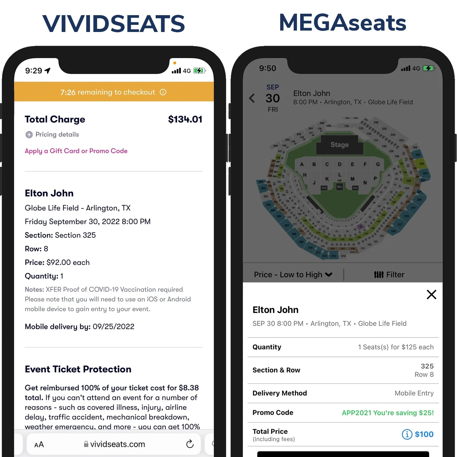 MegaSeats always shows you the final price up front. We aren't trying to fool you. What you see is what you pay. When you compare the final price you'll pay on MegaSeats versus our competitors, you'll save big shopping with us. What are you waiting for? Download the app now and get the transparency and savings that you deserve.