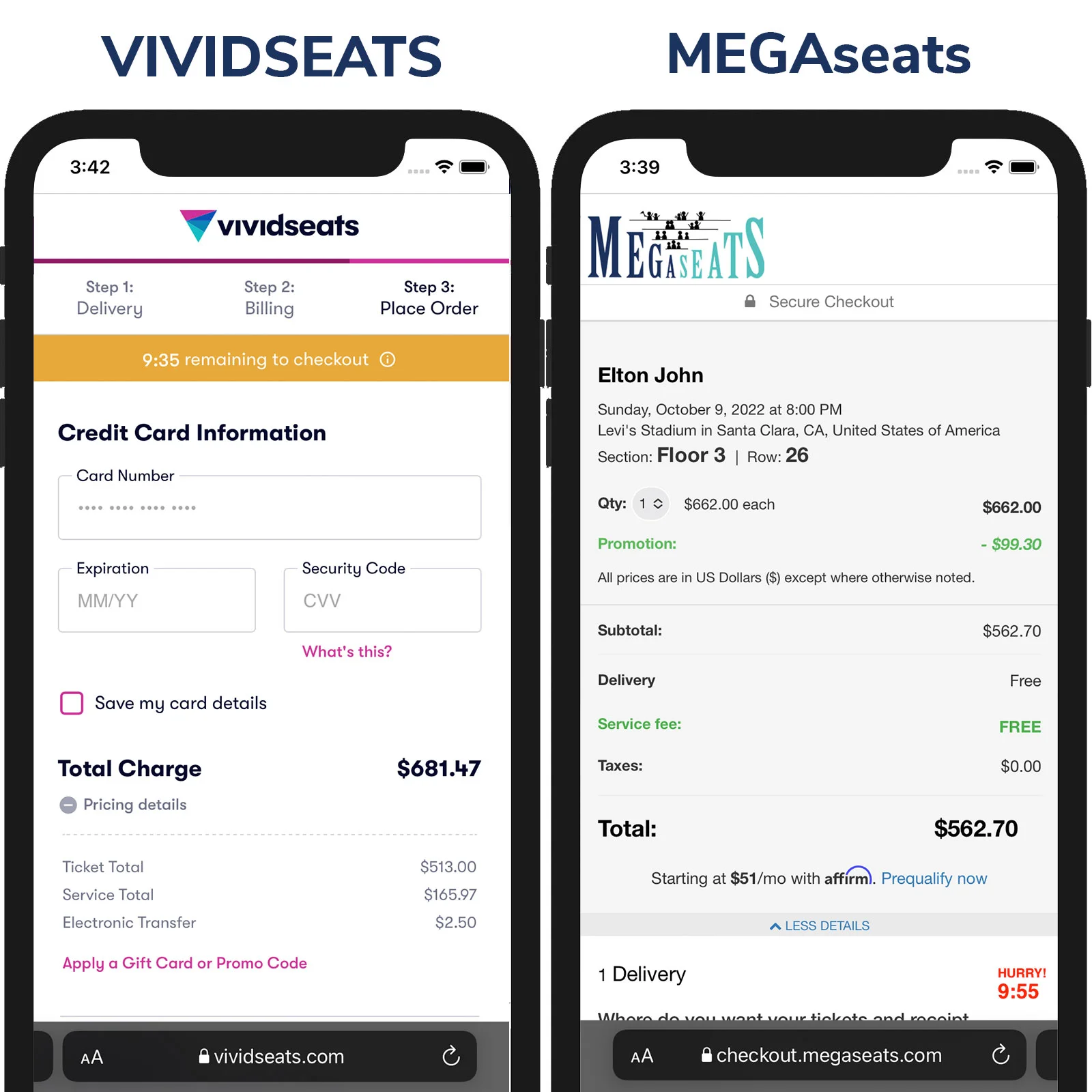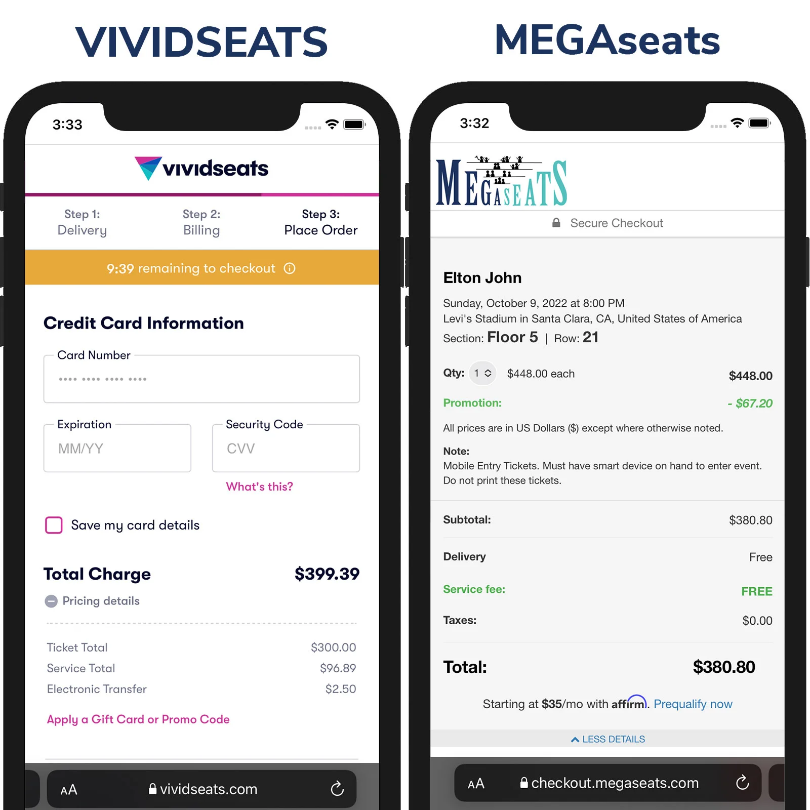 But once you input your payment method Vivid Seats adds more than 35%% to the price you see in the form of Service Fees and Transfer Fees. At checkout Megaseats, A No Fees sites is clearly cheaper , along with our 15% NOFEES15 Embedded Discount!